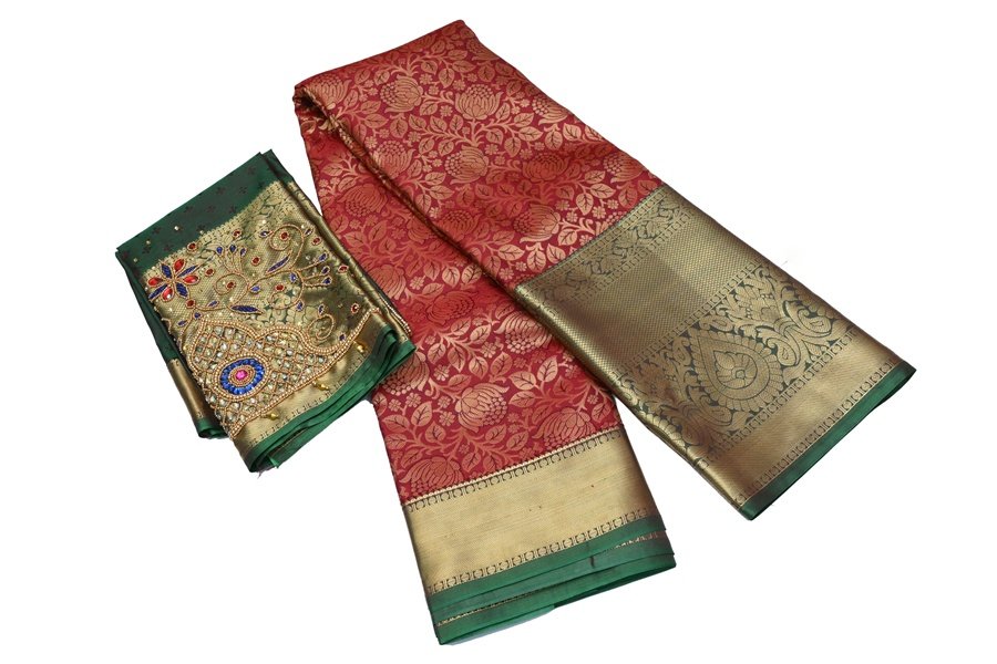 This Crimson Red Pattu Saree showcases a rich, heavy gold weave that flows into a Forest Green Pattu Border and pallu. The green blouse accompanying this Pattu Saree is a masterpiece, featuring intricate gold embroidery and ruby-red stone droplets that tie back to the primary color of the Pattu Saree.